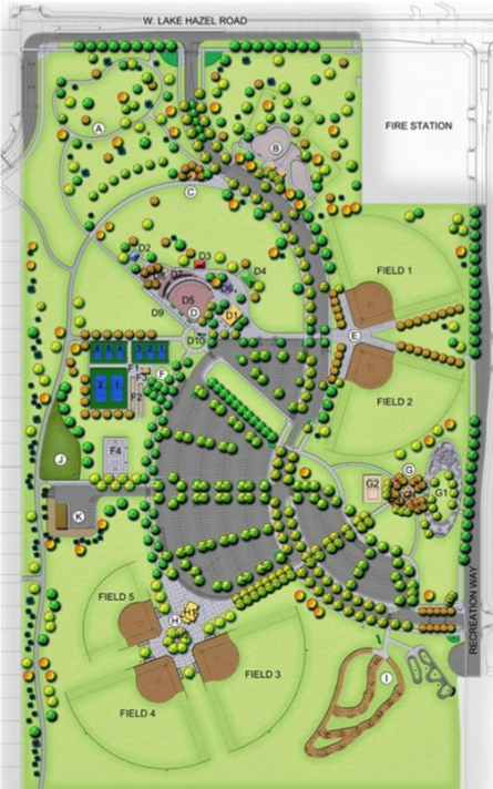 Playground, Splashpad, Sand and Water Play Area, Dual Zip Lines, Roller Slides, Climbing Wall, Idaho-Themed Interpretive Panels, Selfie Station, Toddler Play Structure, Pickleball and Tennis Courts, Bocce Ball Courts, 40-Yard Dash Challenge, Basketball Courts, Skatepark, Sand Volleyball Court, Hammock Poles, Shelter with WiFi, Bike Park and Pump Track, Softball Fields, Public Art, Benches, Picnic Shelters, Restrooms, Seasonal Concession Stand, Pathways, Off-Leash Dog Park, Covered Performance Stage with Lawn Seating, Bike Repair Station
